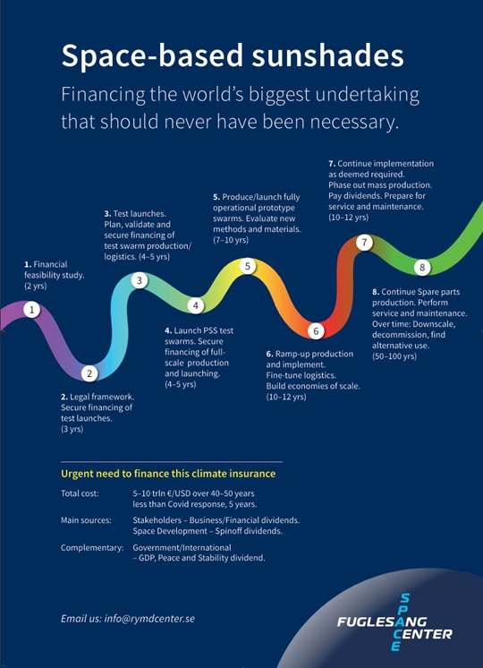 Försäkrings- och riskreducerande lösningar för värsta-falls-scenarier.Hur vi kan förbereda oss, och noggrant utforska, lösningar inför ett eventuellt framtida behov att minska inkommande solstrålning så att jordens temperaturökning begränsas.En rymdbaserad lösning förefaller minimera sidoeffekter och beroendet av framtida finansiering (och därmed politiska risker).